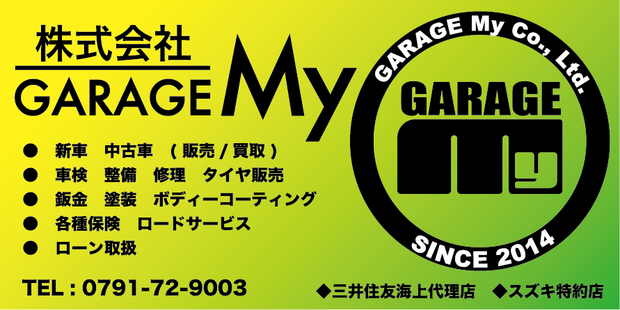 中古車販売から車検まで!たつの市にあるガレージマイ様からの依頼! 看板更新に伴うロゴの作成、看板デザイン、名刺デザイン、ステッカーデザイン。 尖ってないデザイン、万人受けするデザイン、など要望を形にできたかと思います!